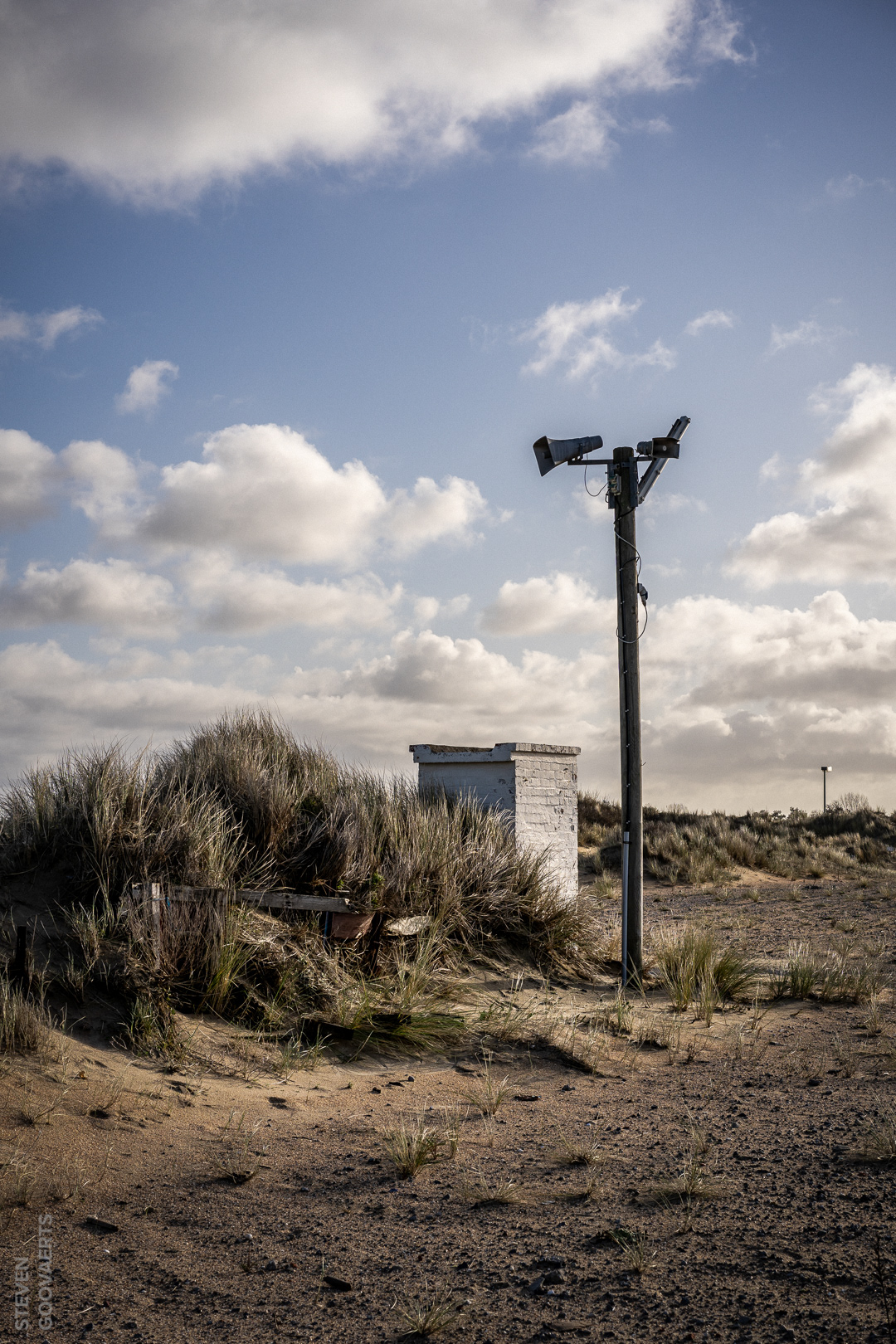 Restanten van de vroegere camping Zeepark in De Panne. Het is gissen naar wat er doorheen de luidsprekers galmde. Nu rest een desolate vlakte waar je elk moment een figuur uit een spaghettiwestern verwacht. Je weet maar nooit met die Saloon enkele honderden meters verder... even verder).